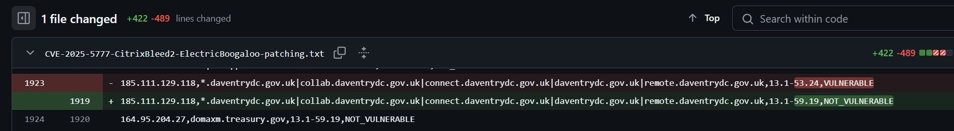 With the #CitrixBleed2 patch data I publish it's possible to view the history on Github for each new scan and see when hosts change from vuln to patched.