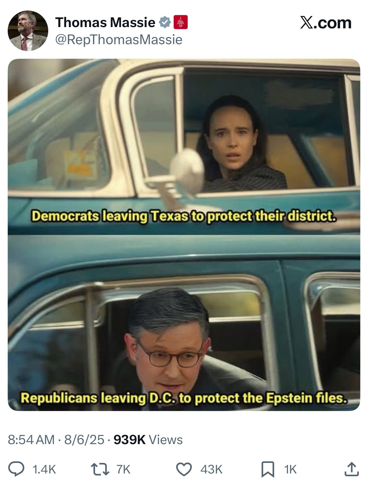 Wow — REPUBLICAN Rep. Thomas Massie points out the hypocrisy of Republicans crying foul about Texas Dems leaving to stop Trump from stealing 5 seats in Congress as Speaker Johnson and the GOP flee Washington to help Trump cover up the Epstein files.
