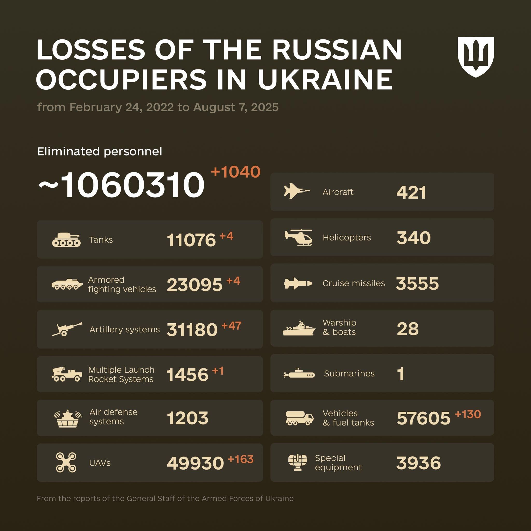 Estimated russian losses from February 24, 2022 to August 07, 2025 of the russian all-out war against Ukraine, according to the General Staff of #Ukraine
