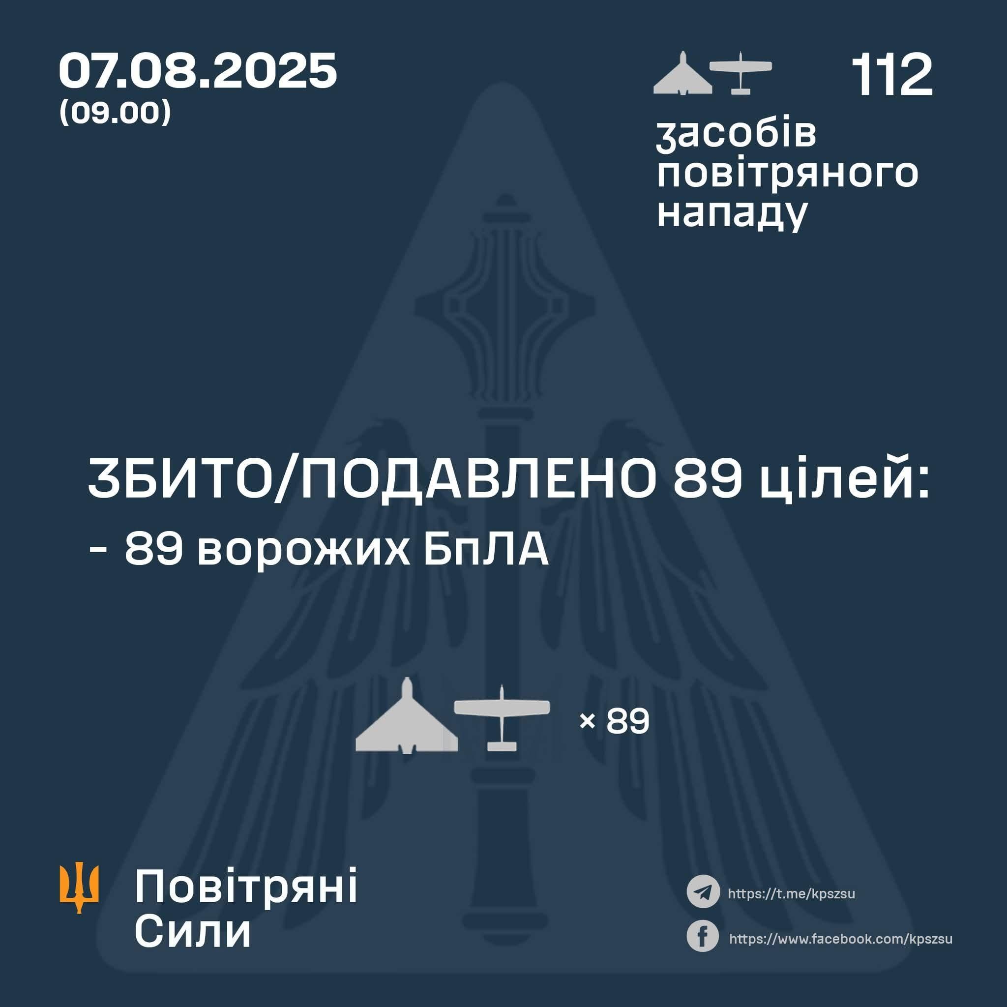 Preliminary data, as of 9:00 a.m., air defence forces shot down/suppressed 89 enemy Shahed-type UAVs and various types of drone simulators