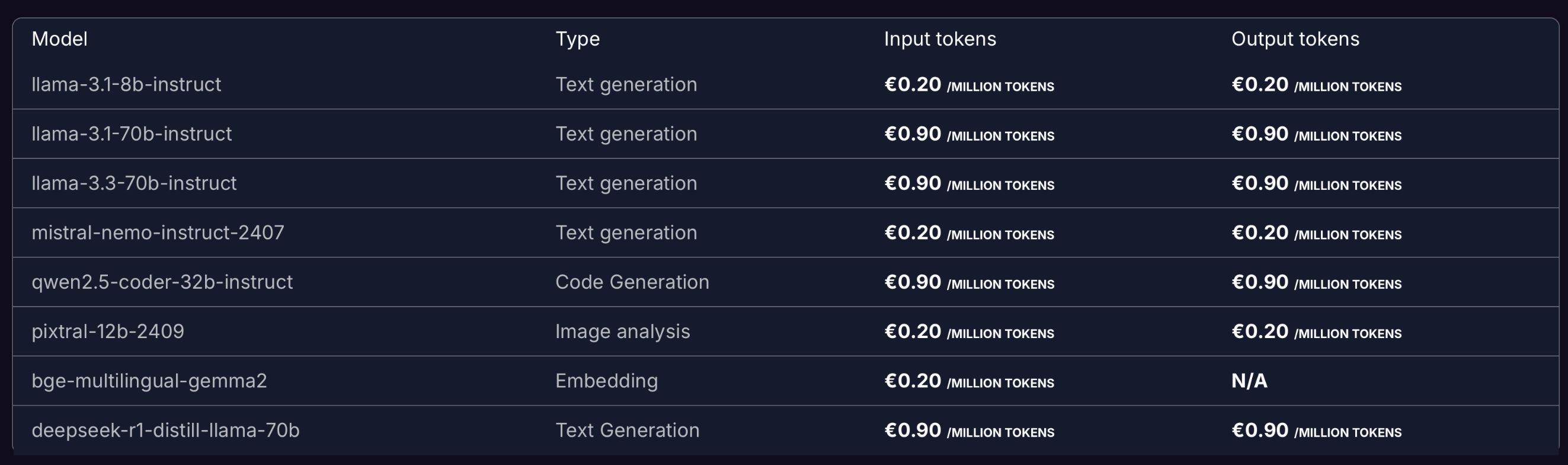 These are the prices from DigitalOcean (white background, US but purely in the hosting business) and Scaleway (black background, French). Typically around a dollar/euro/pound per 1M tokens for a mid-tier model or 2k/month.