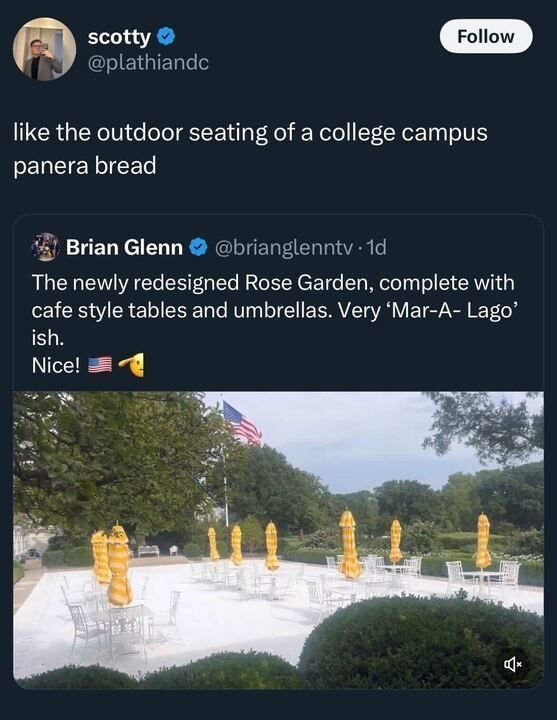 @georgetakei@universeodon.com Nice little cafΓ© they got there. I guess that means anyone in the United States can go there and order food for a reasonable price. Maybe even for free, since I had tax dollars paid for this white trash set up itβs white trash set up because itβs at the White House not Some mall or shopping center where it would be very nice.