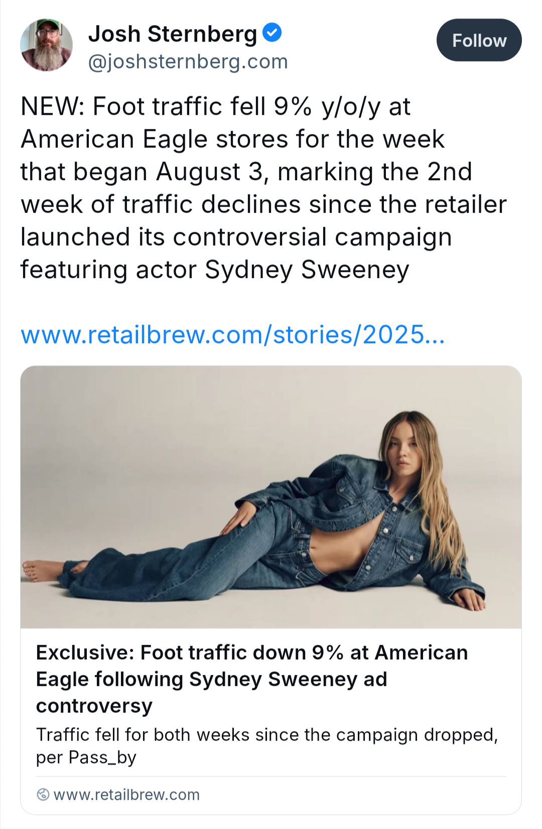 "NEW: Foot traffic fell 9% y/o/y at American Eagle stores for the week that began August 3, marking the 2nd week of traffic declindes since the retailer launched its controversial campaign featuring actor Sydney Sweeney