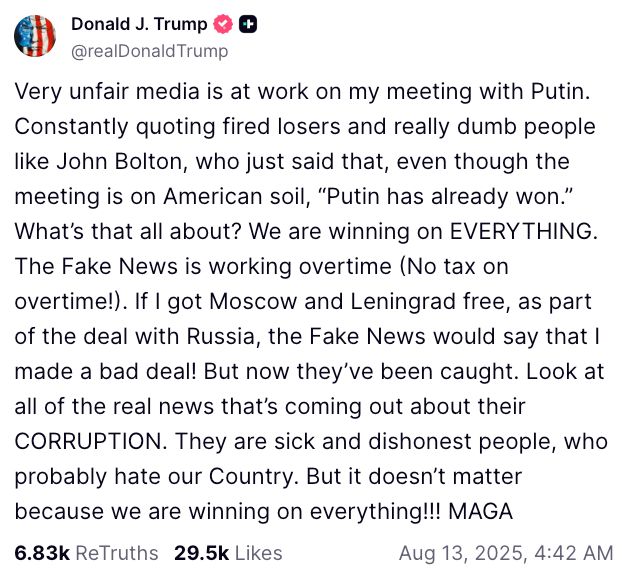 Trump’s response to the FT report about “no Russia experts in the room in Alaska” is predictably ad hominem (though Bolton admittedly deserves such insults). Trump totally ignores the disaster he’s created at State. My takeaway is that he wavers between two extremes when it comes to Ukraine.