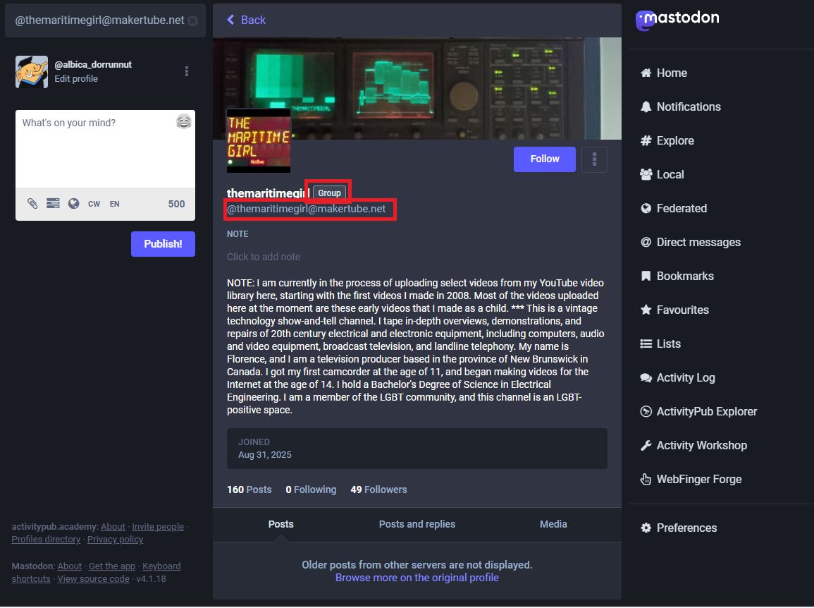 @dannekrose@brioco.social I see. Okay. Based on what I’m seeing on this account, I guess I was targeting the owner and not the channel? In Mastodon, the channel is essentially boosting the owner’s videos?