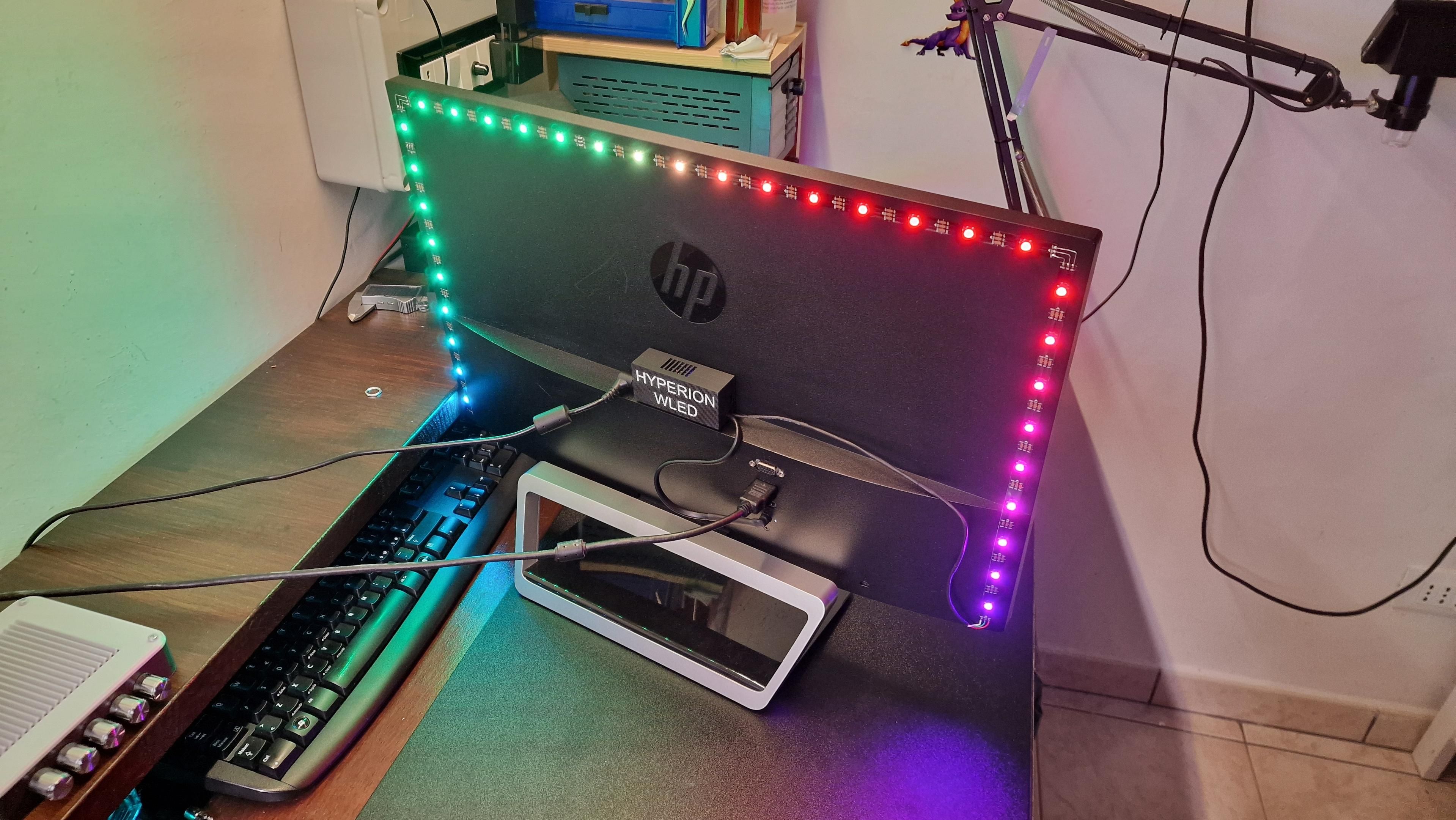 Il tutto funziona con un #ESP32 con sopra installato #WLED e una striscia #led #WS2812b e un semplice programma multipiattaforma chiamato Hyperion che si occupa di catturare l'immagine a schermo e trasferirla a WLED. Trovate le guide per entrambi ovunque nel web