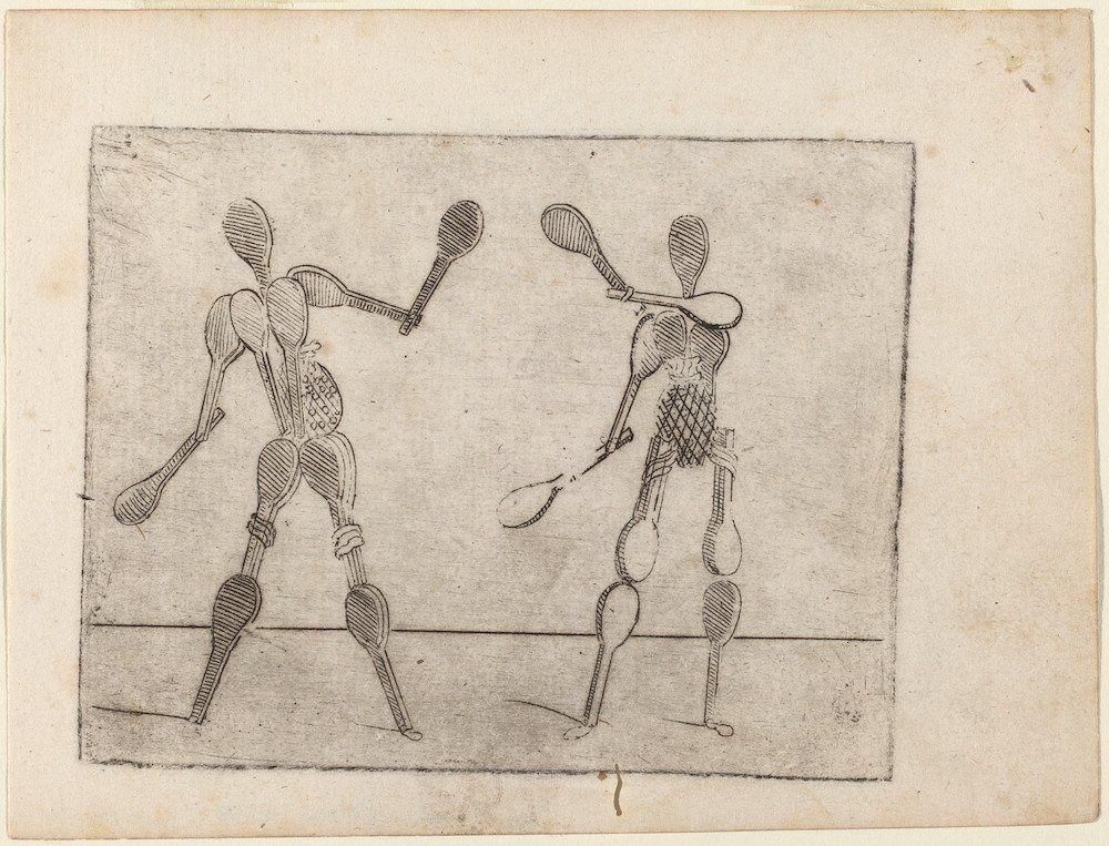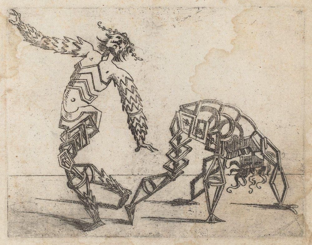 Centuries ahead of its time, Giovanni Battista Bracelli's "Bizzarie di Varie Figure" (1624) depicts figures made from a range of objects, mostly abstract — cubes, rings, squares — but also such things as rackets, screws, and braided hair.