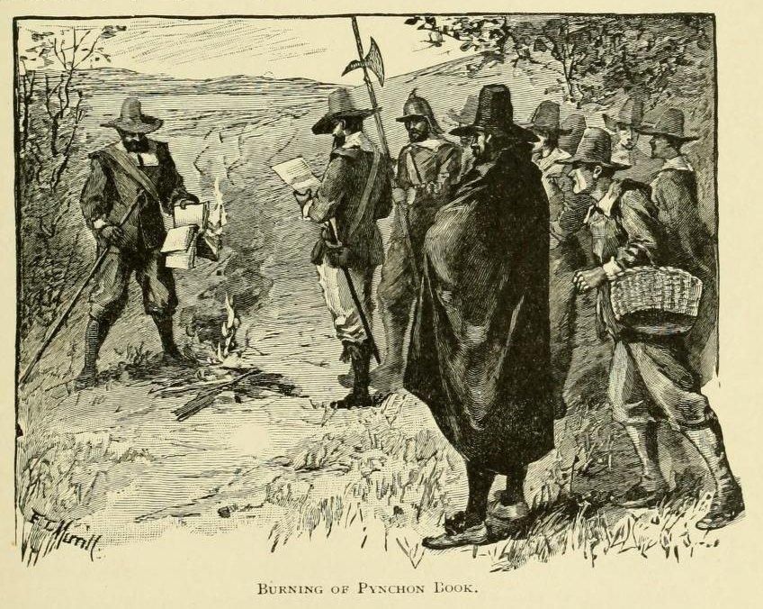One of the first books to be banned and burnt in the New World was by an ancestor of the author Thomas Pynchon. More in our essay by Daniel Crown βThe Price of Sufferingβ: https://publicdomainreview.org/essay/the-price-of-suffering-william-pynchon-and-the-meritorious-price-of-our-redemption