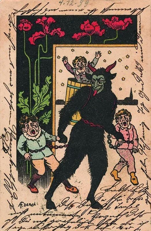 Careful out there tonight for it's #Krampusnacht! Popular in German-speaking Alpine folklore, the figure of #Krampus is a devil-like horned creature who punishes badly-behaved children the night before St Nicholas' Day. More Krampus cards here: https://publicdomainreview.org/collection/greetings-from-krampus