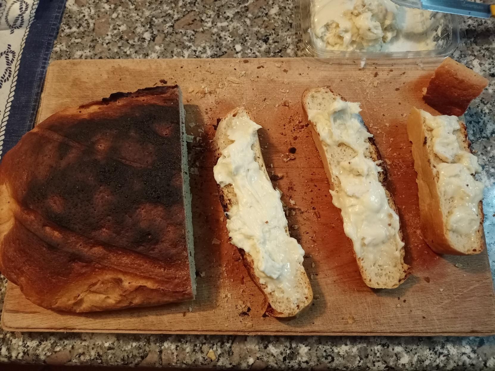 Ahimè l'ho lasciato qualche minuto (pochi) in forno più del dovuto. Ho compensato spalmandone le fette di gorgonzola.