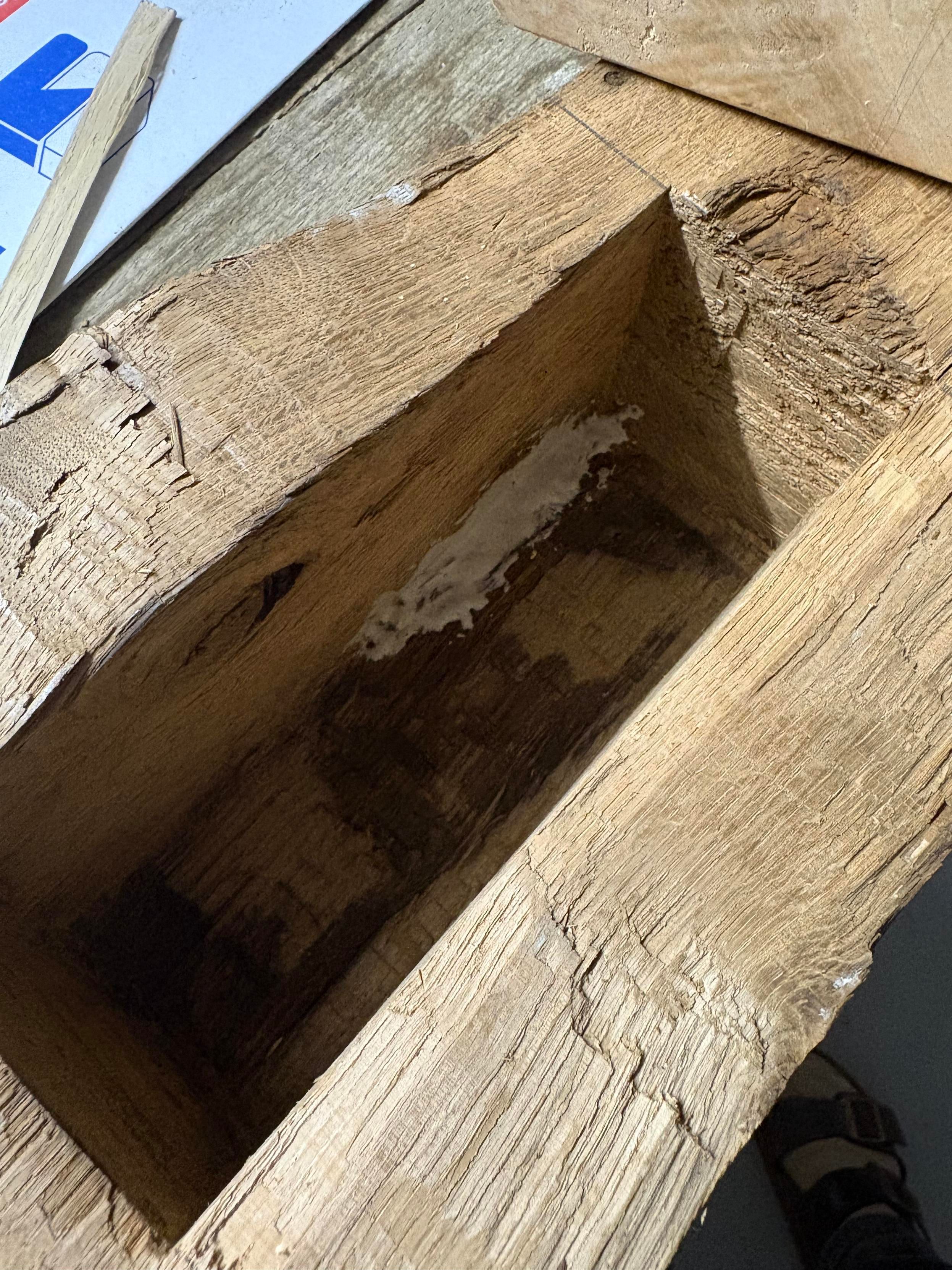 Will have to epoxy tomorrow. I suspect there is a crack in one bottom corner of the mortise that goes through to where the post got thin from worm/rot damage.